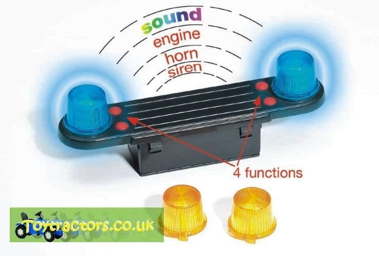 A fantastic addition for all Bruder Trucks. Features flashing lights with interchangeable Blue or Amber lenses plus 3 sound functions: Realistic engine noise, horn and siren.